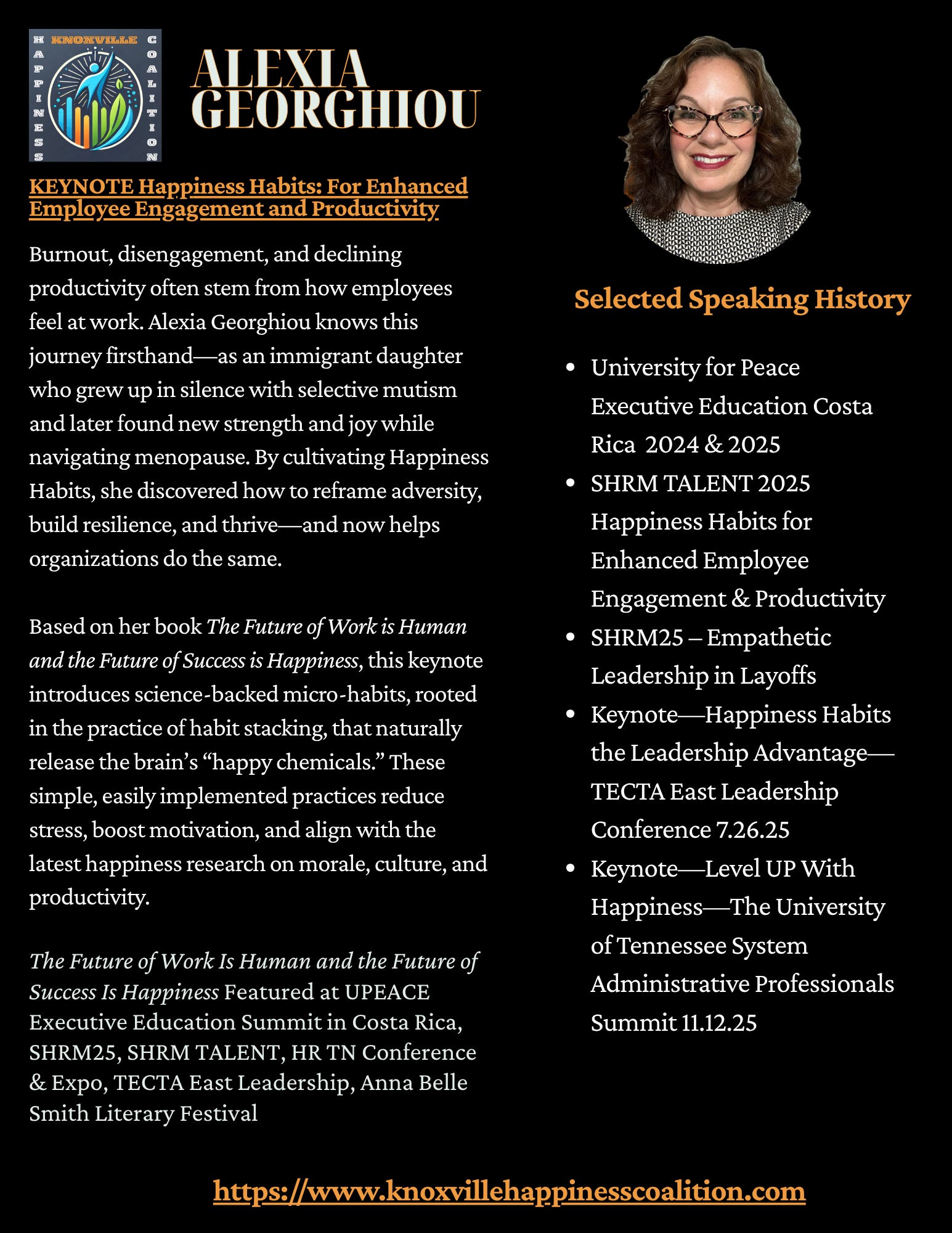Alexia Georghiou is a keynote speaker on happiness and human-centered leadership, organizational development consultant, and founder of the Knoxville Happiness Coalition. She partners with executives to build values-driven cultures that foster resilience and well-being. Author of The Future of Work is Human and The Future of Success is Happiness, her work has been featured at UPEACE Executive Education in Costa Rica 2X, SHRM25, and the University of Tennessee Systemwide Administrative Professionals Summit. Through her V.A.L.U.E.S. Model—Vision, Action, Leadership, Unity, Engagement, and Synthesis—she helps leaders align performance with purpose. Alexia has developed 25+ courses featured in LearnFormula’s 2025 Mini MBA for CPAs. Her writing has appeared in Florida SHRM Newswire, Yahoo News, and the Knoxville News Sentinel. Alexia is an adjunct professor at the University of Tennessee and teaches her Strategic Leadership masterclass through the Knoxville Happiness Coalition.