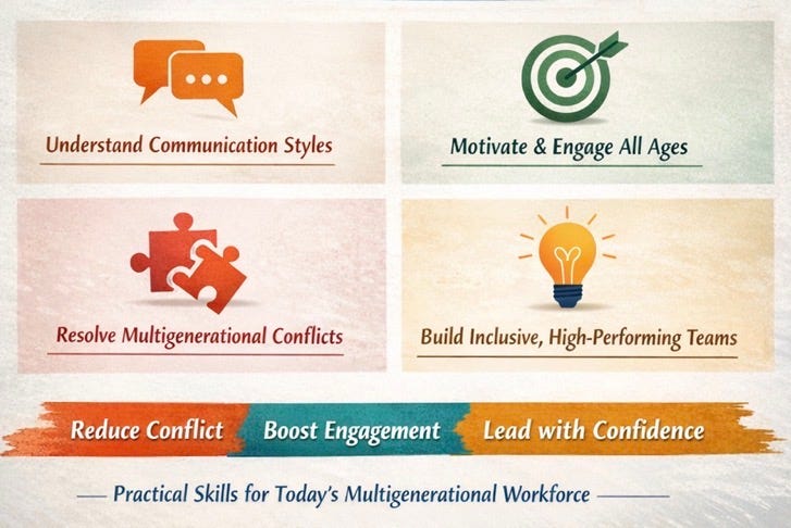 Working with Multigenerational Teams is a practical, skills-focused course designed to help professionals collaborate more effectively across age groups—without stereotypes, eye-rolling, or forced team-building exercises.